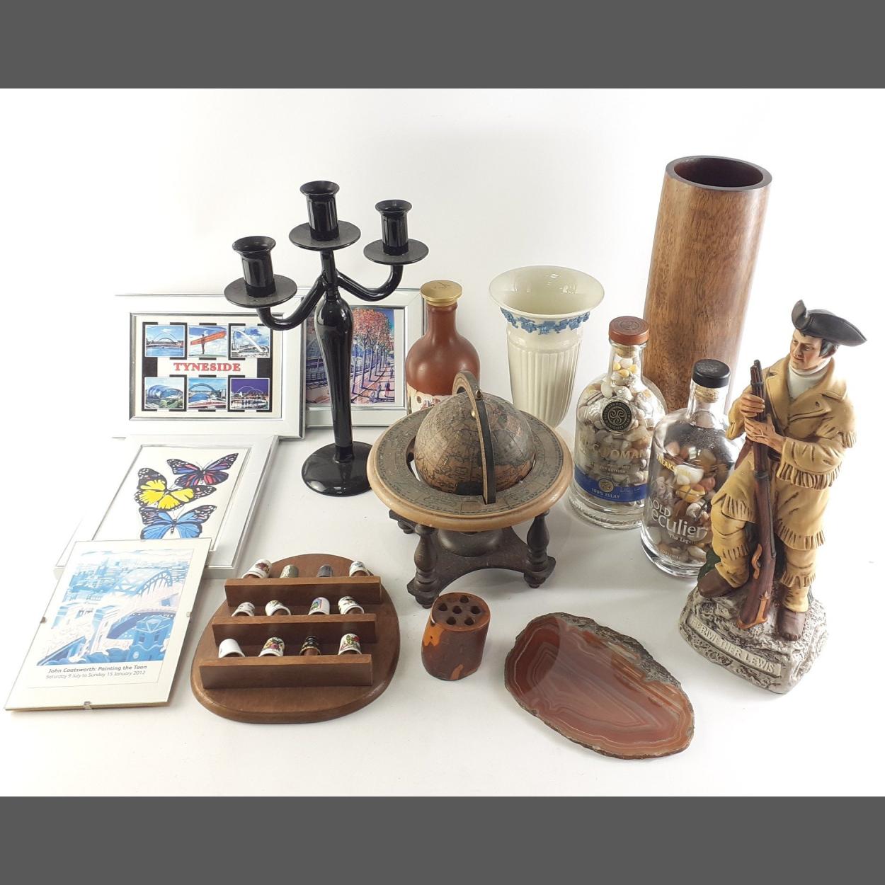 A mixed decorative lot to include shells in bottles, thimble collection, wooden vase, American figure etc.