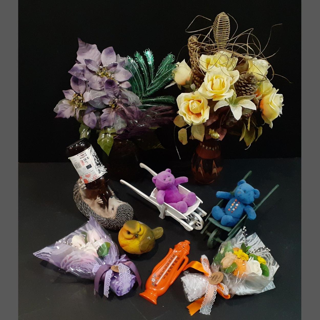 A mixed decorative lot, studio pottery, resin hedghog, Teddy Bear wheelbarrows and artificial flowers.