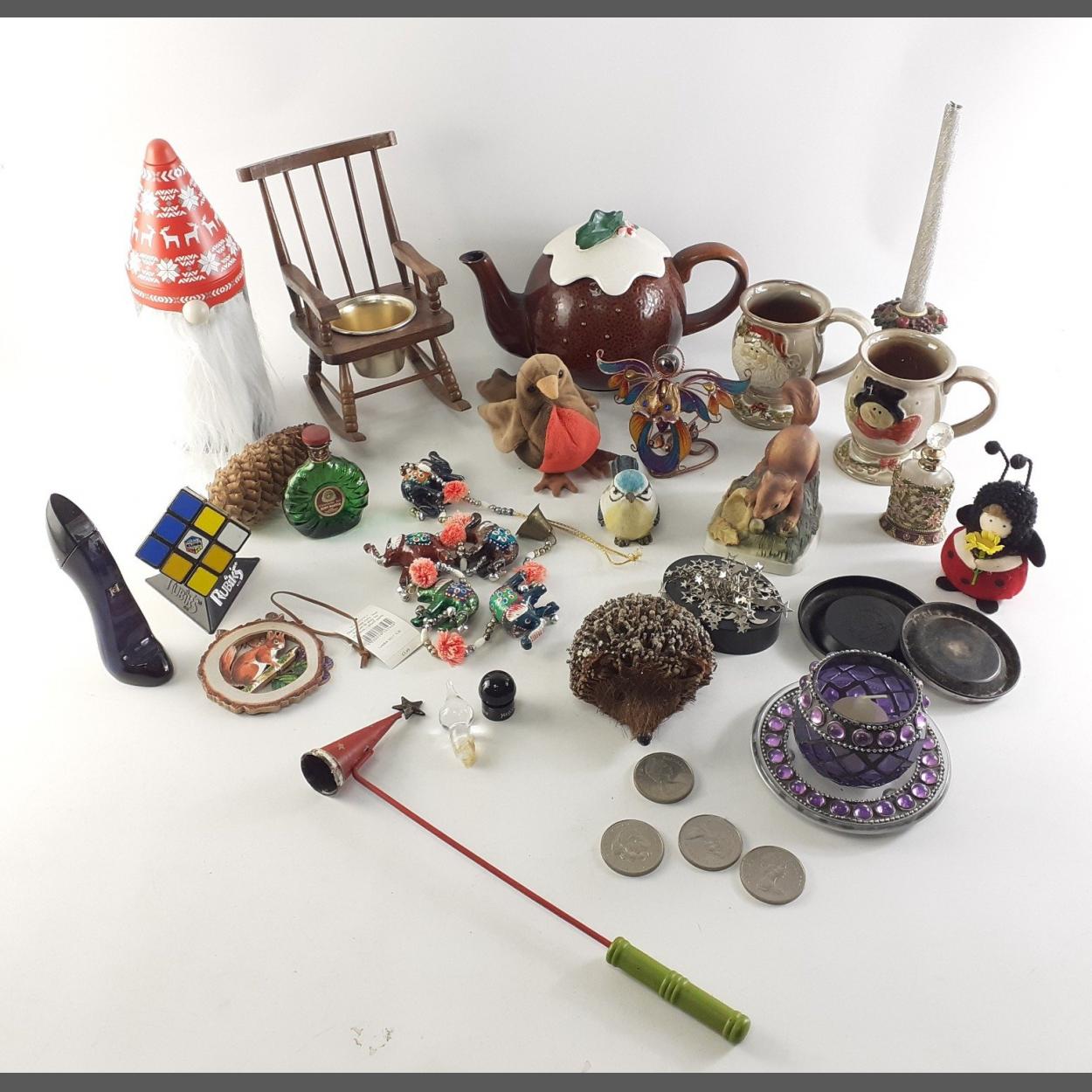 A mixed lot pod decorative and fun items to include some Christmas decorations, teapot, Robin etc.