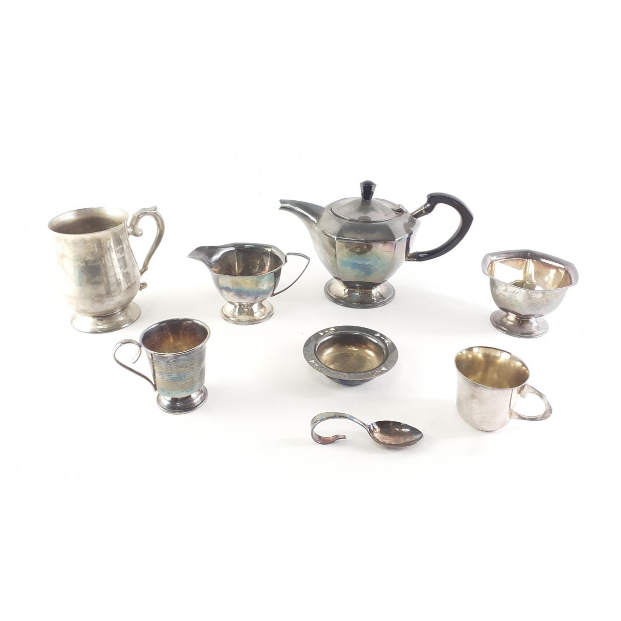 A good quality silver plate lot including teapot, milk jug and sugar, christening set, presentation tankard etc.