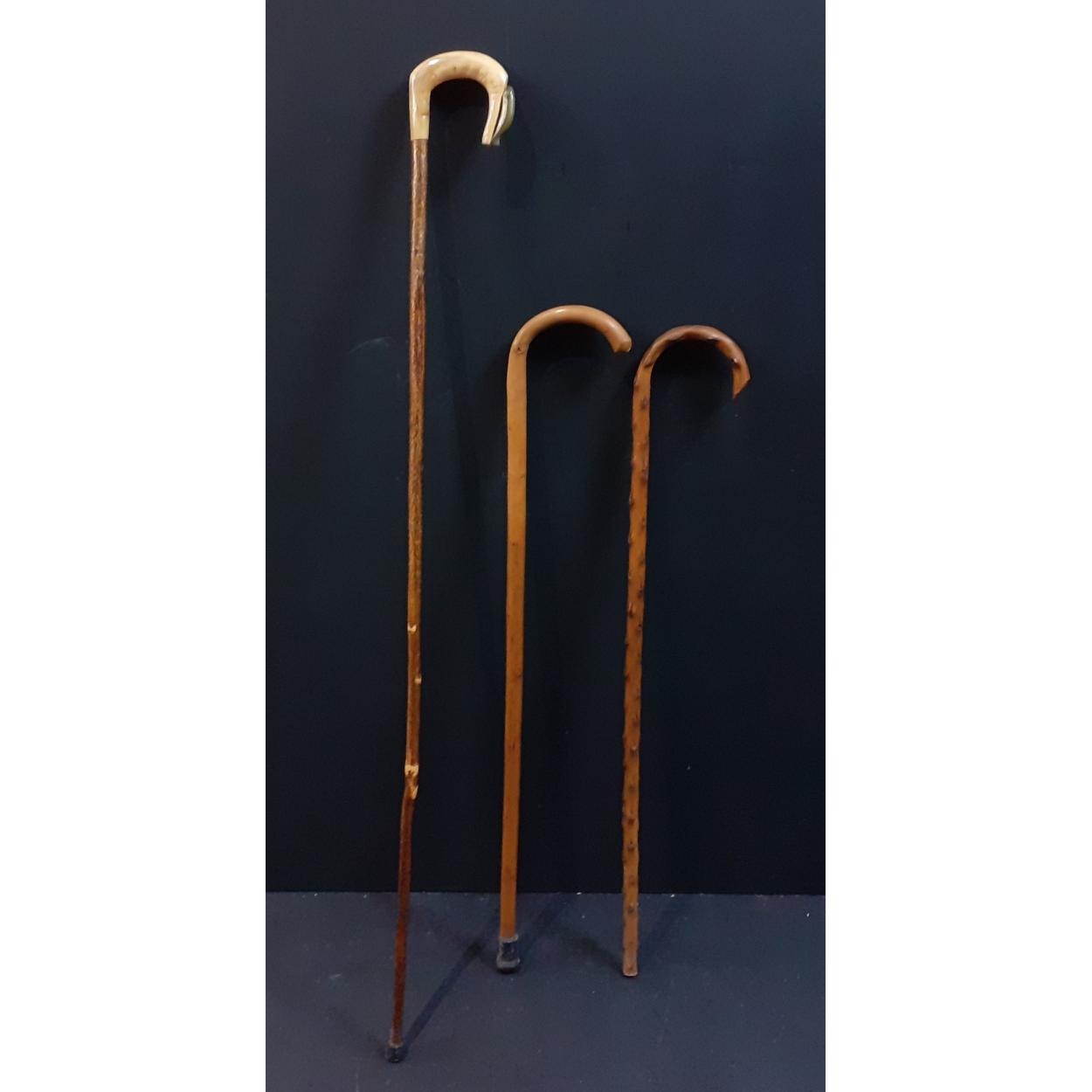 Three Walking Sticks, includes one Shepherd’s Crook with a super wee horn carved trout to the handle, 125cm approx. All in good useable condition.