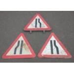 Three lane merge signs. Two metals signs, one mounted on hard plastic. Largest 87cm tall approx