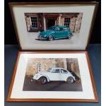 ICONIC BEETLES! Two framed photo pictures of a 1964 and c1960s VOLKSWAGEN BEETLE - dimensions 65cm x 45cm approx each