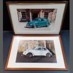 ICONIC BEETLES! Two framed photo pictures of a 1964 and c1960s VOLKSWAGEN BEETLE - dimensions 65cm x 45cm approx each