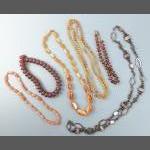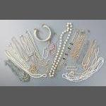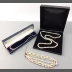 Three sets of faux pearls within 2 presentation boxes. Sets include: triple strand set with brass style clasp approx 35cm in length, graduated pearls with base metal clasp set with 3 paste stones approx 41cm and last set a continuous strand of similar sized faux pearls with no obvious clasp, approx 80cm long