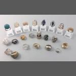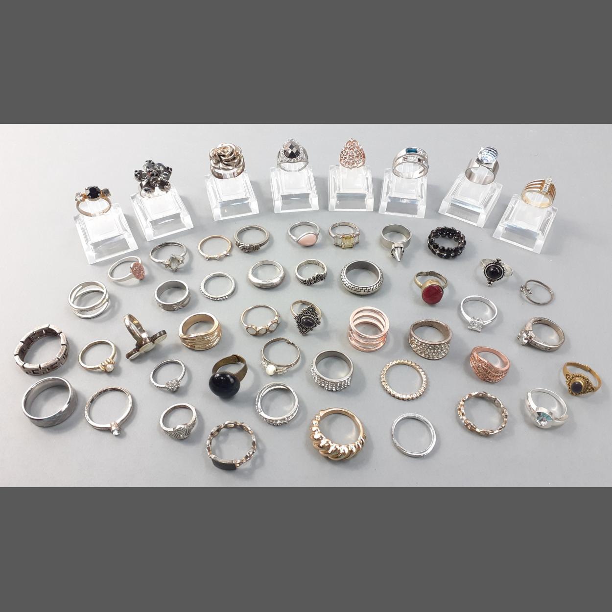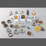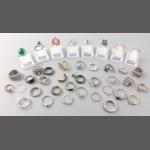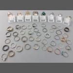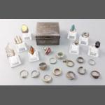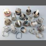 A small CHARMING Indian white metal box with scenes of hunting tigers (8x8x4cm approx) complete with contents of chunky white metal rings in a variety of sizes
