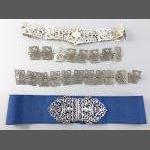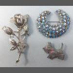 Three attractive brooches to include a marcasite rose (8cm long approx), a brooch studded with blue stones and a gorgeous filigree Scottie dog