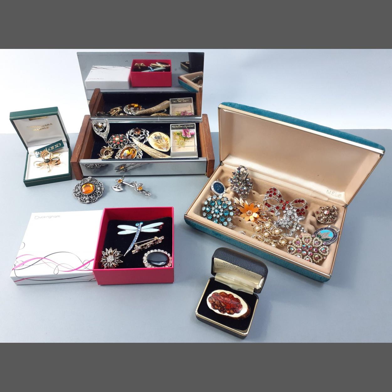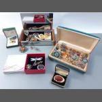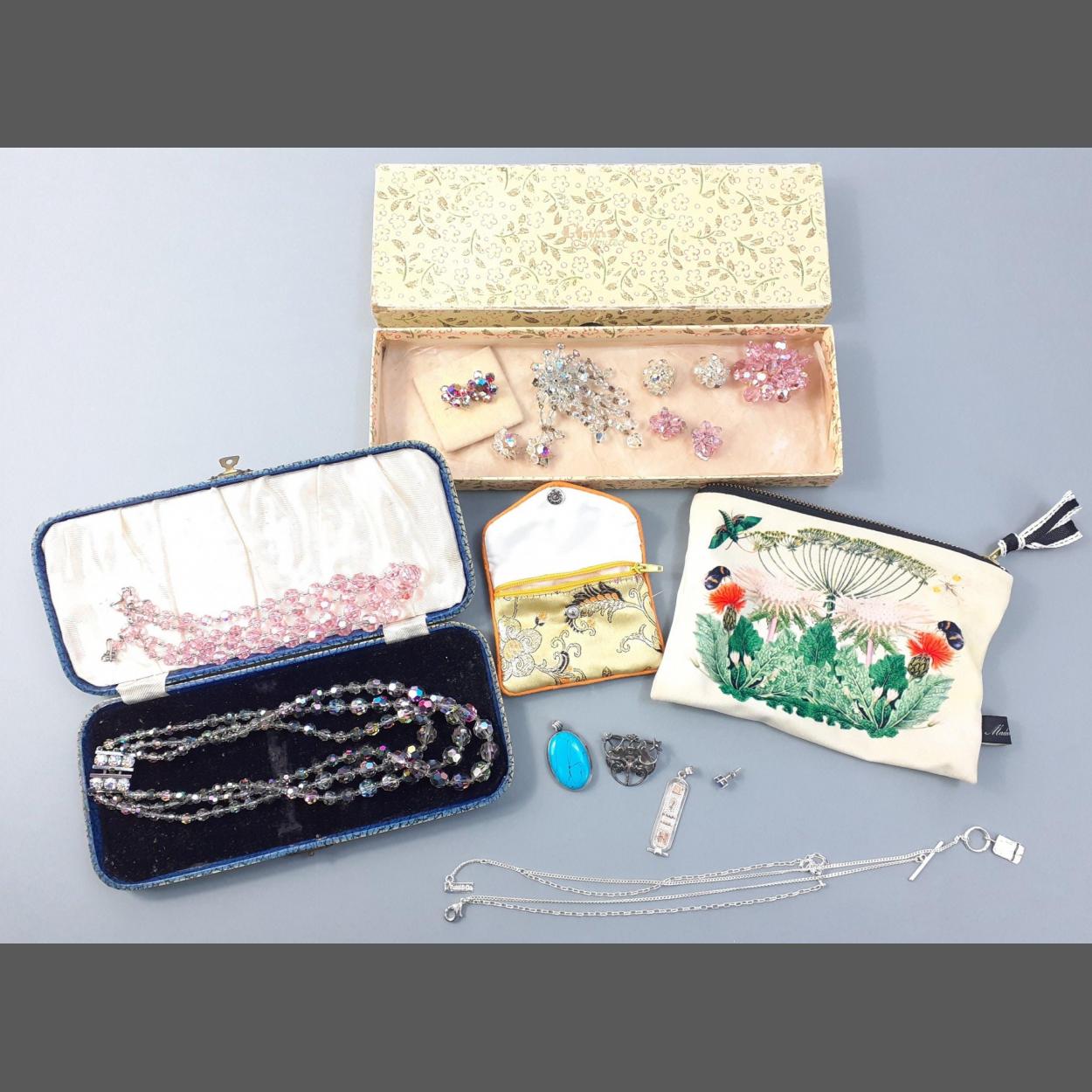 A mixed lot of jewellery to include brooches, earrings, necklaces, bangle, new earring backs, a travel clock, etc