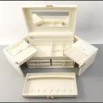 A very useful cream leatherette pull out jewellery box with 4 drawers, plus other sections for rings, necklaces, and an interior mirror