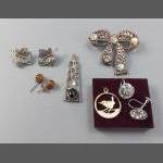 A small VINTAGE mixed costume jewellery lot to include a lovely pendant, cut gilded farthing, a brooch, and 3 super sets of earrings including a tiger eye, marcasite leaves, large faux diamonds