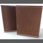 A pair of 1960's Wharfdale Dalesman wooden cabineted, fabric fronted speakers with wear but known to be functioning. Height 63cm approx, width 51 cm approx, depth 16cm approx.
