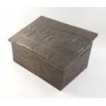 A lovely fireside slipper box, beaten brass outer with worn felt lining 36 x 25 x 20cm height at highest point.
