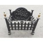 A cast iron fire grate with embossed medieval scene on back plate H39xW42xD27cm approx