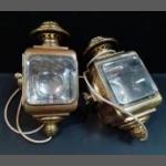 A pair of STUNNING! 20th century brass BLERIOT of London and Paris carriage lamps converted to electricity one with a cracked lens H40xW20xD20cm approx