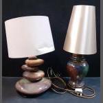 A ceramic cairn style table lamp with shade, stands 60cm to top of shade approx plus a converted ginger jar table lamp on a wooden plinth with shade standing 65cm high with shade