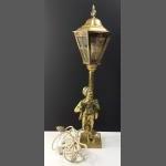An ANTIQUE Art Nouveau style solid brass figural half standard electric converted table lantern - there is one broken pane to replace - there is writing stamped to the base but indistinct (one word is French we think) a charming object! - 70cm tall approx