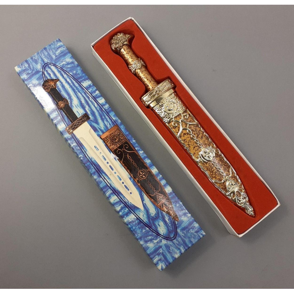 An ornate boxed modern Oriental dagger in sheath. Metal construction. Steel blade with bird finial to the handle. Total length 27cm approx