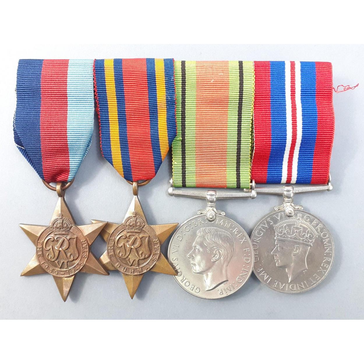 A mounted set of WWII campaign medals to include 39-45 Medal, Defence Medal, 39-45 Star, and Burma Star