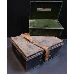 A medium sized legal strong box sealed with a leather strap, with interior tray, W42xD30xH19cm approx plus one other box, smaller with original key with internal 3 part tray, W32xD21xH12cm approx