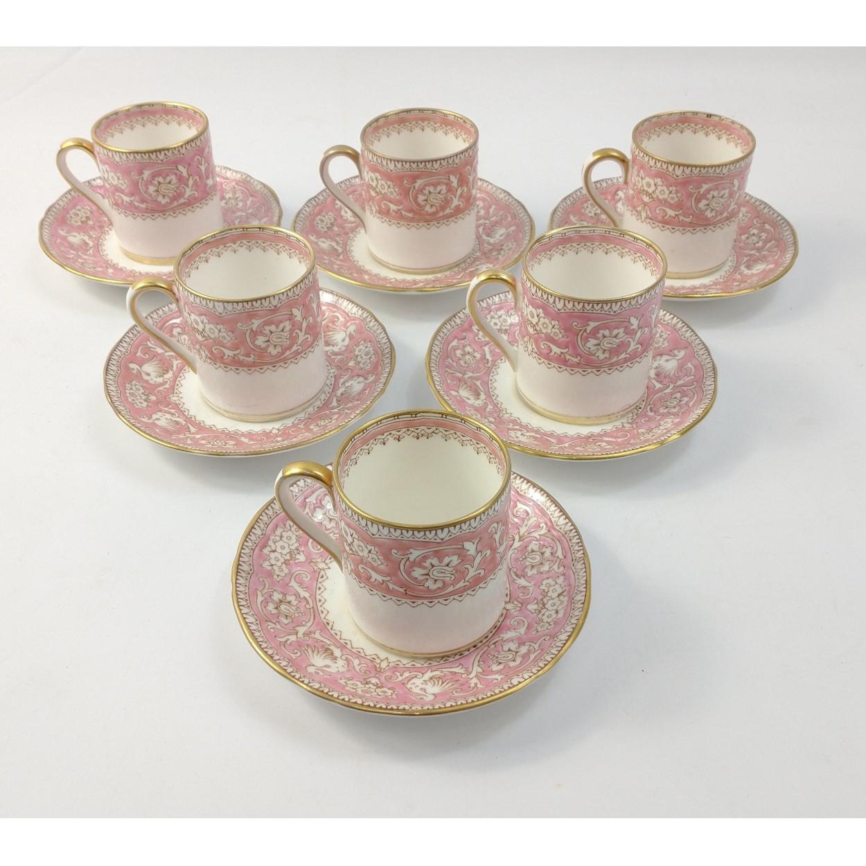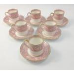 Staffordshire pink 6 coffee cans and saucers in the "ELLESMERE" design featuring nice phoenix design and gilt rims. Coffee cans stand 6cm tall approx and saucers are 12cm wide approx