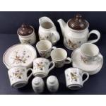 A part ROYAL DOULTON Lambeth ware tea service in wild cherry (LS1038) comprising 6 cups, 6 saucers, 6 side plates, 1 milk jug, sugar bowl and salt and pepper and 1 teapot. All in good condition