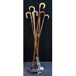 A collection of six walking sticks with horn handles, one with a carved thistle and named to 'Bill'. Lengths approx 120-140cm