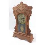 A carved wooden mantle clock by the NEWHAVEN CLOCK COMPANY of Newhaven Connecticut. Nicely carved with key and pendulum inside 57cm high approx