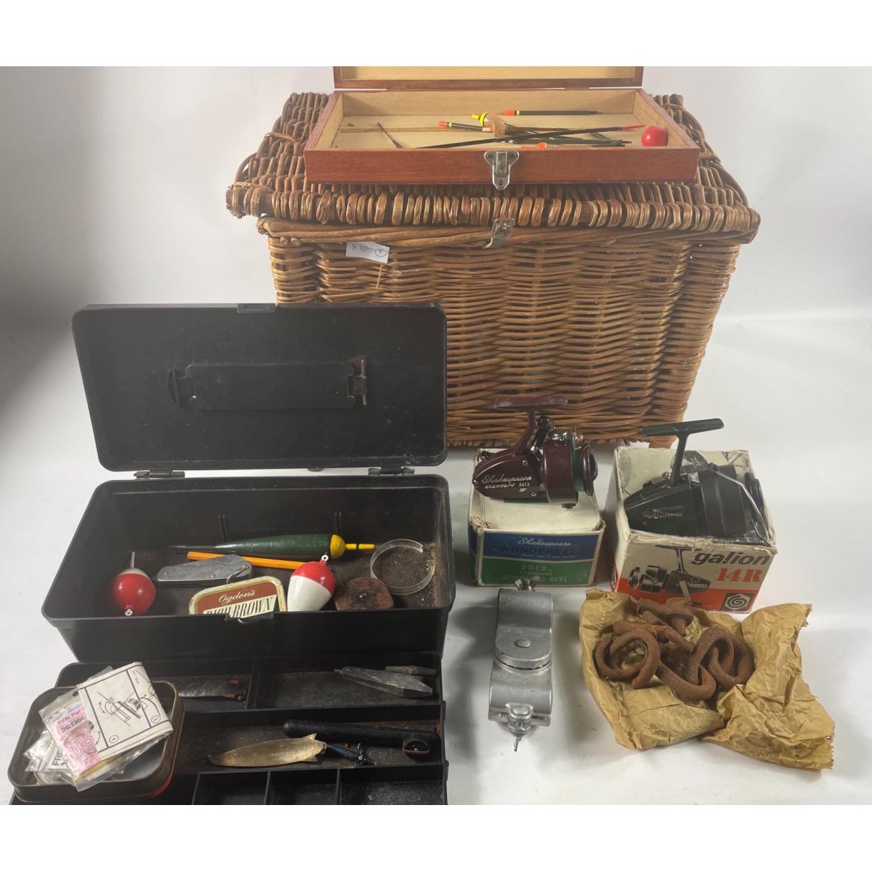 With restrictions easing what better time to take up a new outdoor pursuit - be the compleat angler with this lot to include a FISHERMAN 0145-180 rod, a DAIWA 2123 12' rod, a MARTIN JAMES rod, a SHAKESPEARE 2012 standard spinning wheel, a GALION 14R fixed spool reel, a landing net, a wicker basket and even a sun shade for those sunny days to come