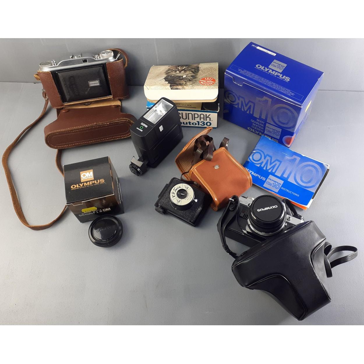An OLYMPUS OM10 with 1:1/8 f=-50mm lens in case. With other vintage pieces.