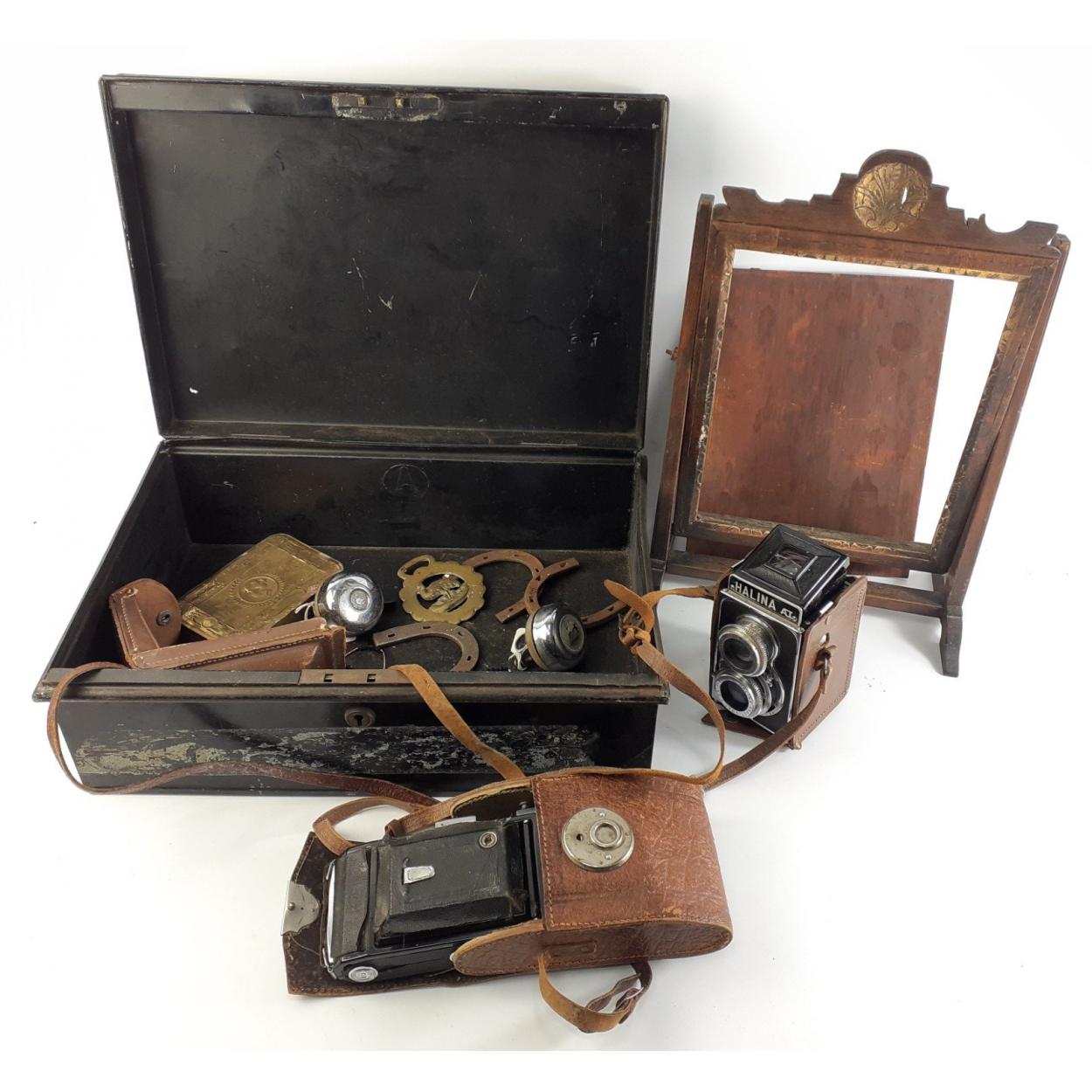 An antique metal deeds box with two cameras, Halina and one other, bicycle bells, horseshoes etc. An intriguing little mixed lot.