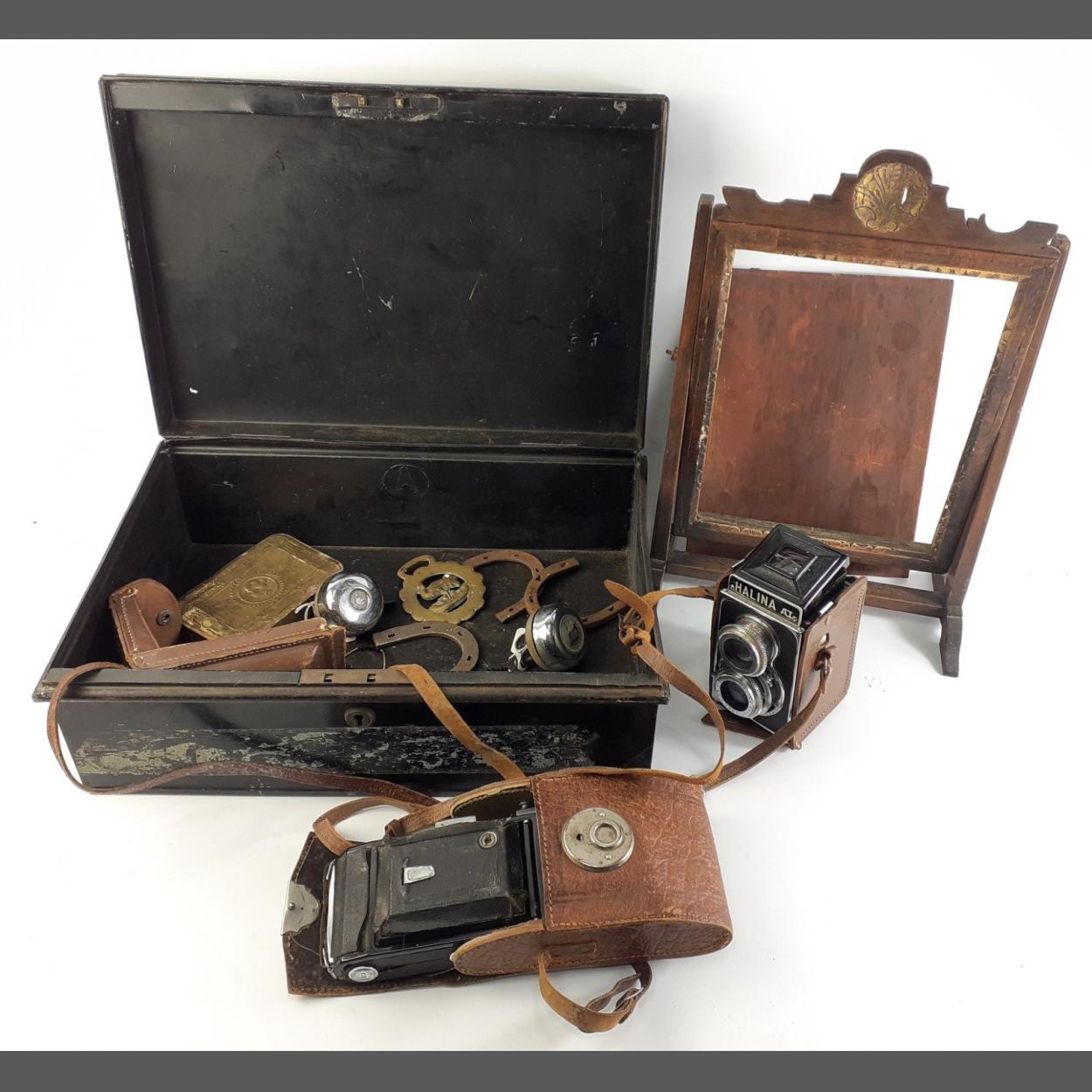 An antique metal deeds box with two cameras, Halina and one other, bicycle bells, horseshoes etc. An intriguing little mixed lot.