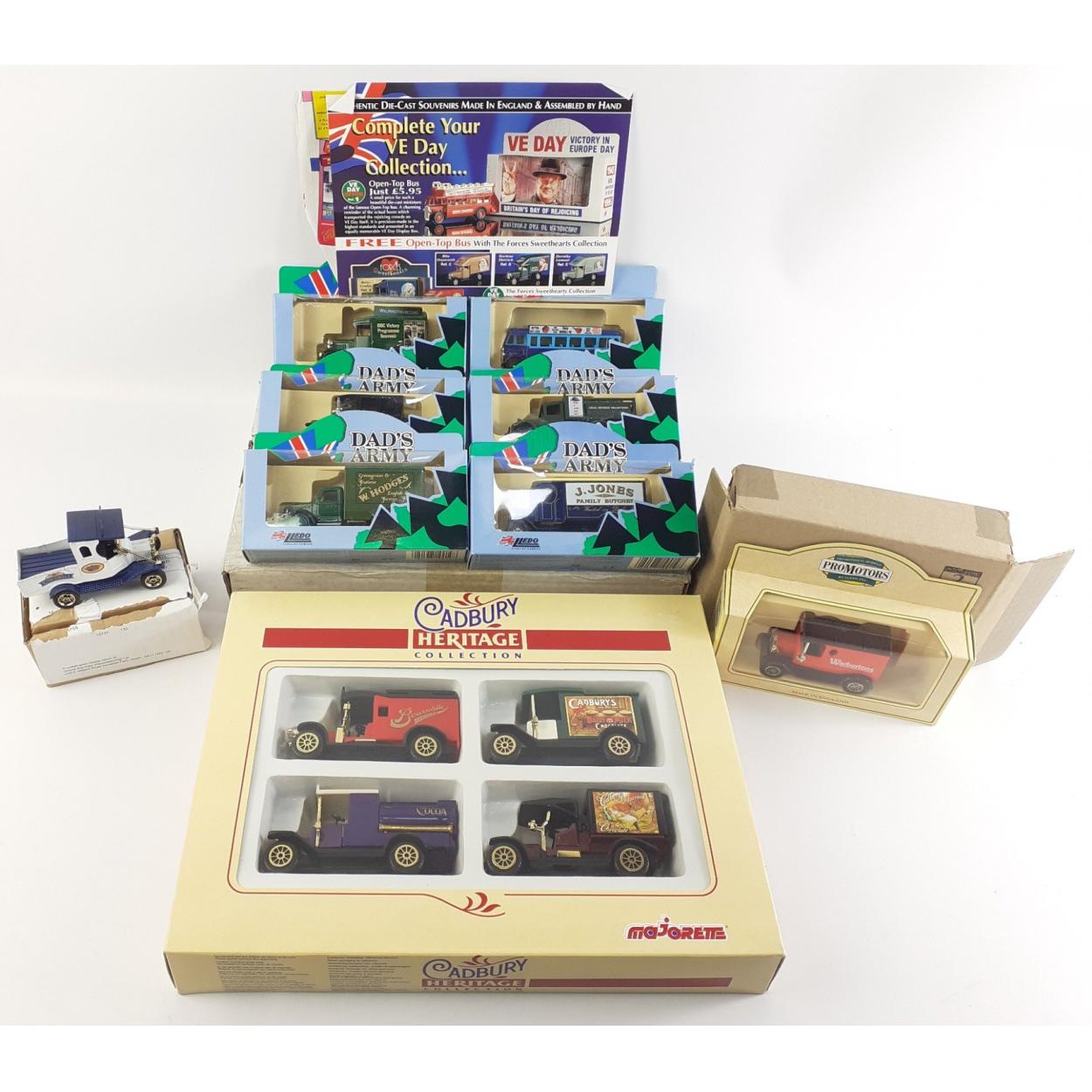Nice modern small diecast car / vehicle collection. Six LLEDO Dads Army models boxed, Cadburys Heritage collection advertising vans in box and two others.