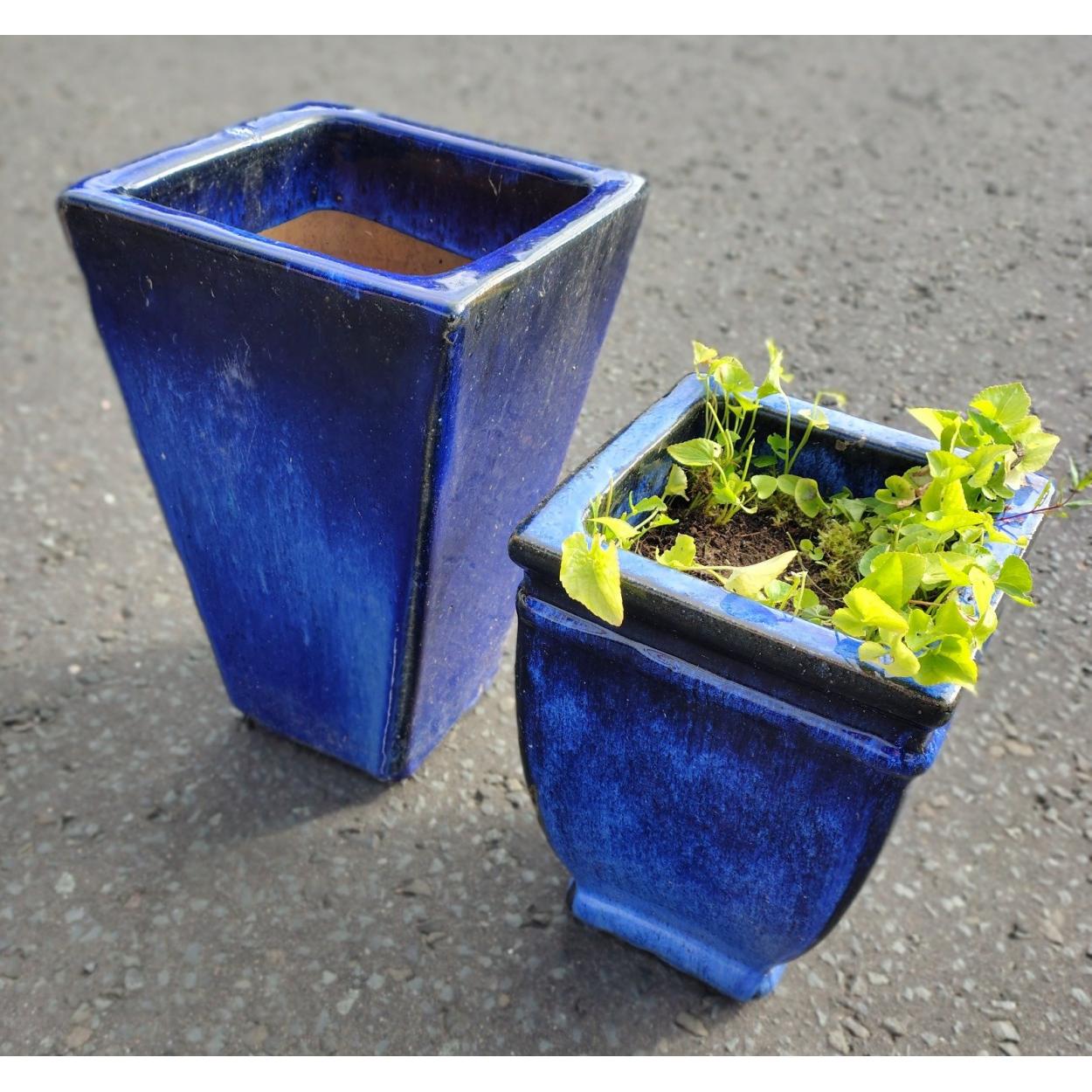 Two CERAMIC blue glazed garden containers (including weeds!) - tallest 40cm tall x square 26cm approx - BIG POTS!