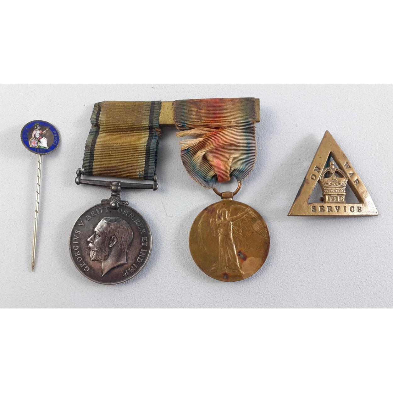 WWI Medal pair of British War Medal and Victory Medal with a 1916 dated ON WAR SERVICE badge and a Silver Threepence enamelled tie pin. Medals named to 32540 Pte. C.O. HYND CAMERONS. Noted on medal rolls as also serving with SEAFORTHS. Mounted and original ribbons worn.
