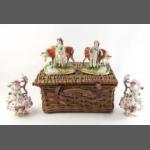 A small wicker picnic basket with a pair of flat-back ornaments (17cm high approx with minor damage to paintwork) and a pair of highly embellished jugs (21cm approx)