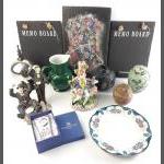 A mixed decorative lot of interesting pieces to include Laurel & Hardy A/F, Mackintosh style clock, pottery vases, green jug, decorative boy on a bench and others including three slate memo boards.