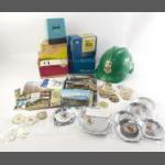 A mixed lot to include four boxed slide viewers, a quantity of modern postcards, uninscribed modern medals and a SOUTH AFRICAN cricket helmet.