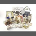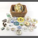 A wicker basket filled with pretty little trinket boxes, dishes, EP items, decorative mirror and a silver lidded perfume pot.