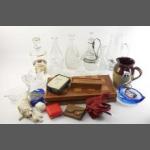 An interesting collection of mainly glassware to include gilt stoppered decanter, ship's decanter, other carafes, ornamental glass dolphins and swans, decorative glass lady, stoneware water jug, etc. Plus a chess and dominoes set.