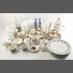 A mixed ceramics lot containing shorter teapot, plates, saucers, 6 milk glass tumblers and cups with grape design all in good condition, part tea service to include some MITTERTEICH large useable floral plates, etc