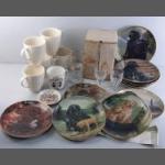 Wedgwood white cream mugs, a boxed set of ROYAL DOULTON sherry glasses, 11 Franklin Mint collectors plates of dogs.