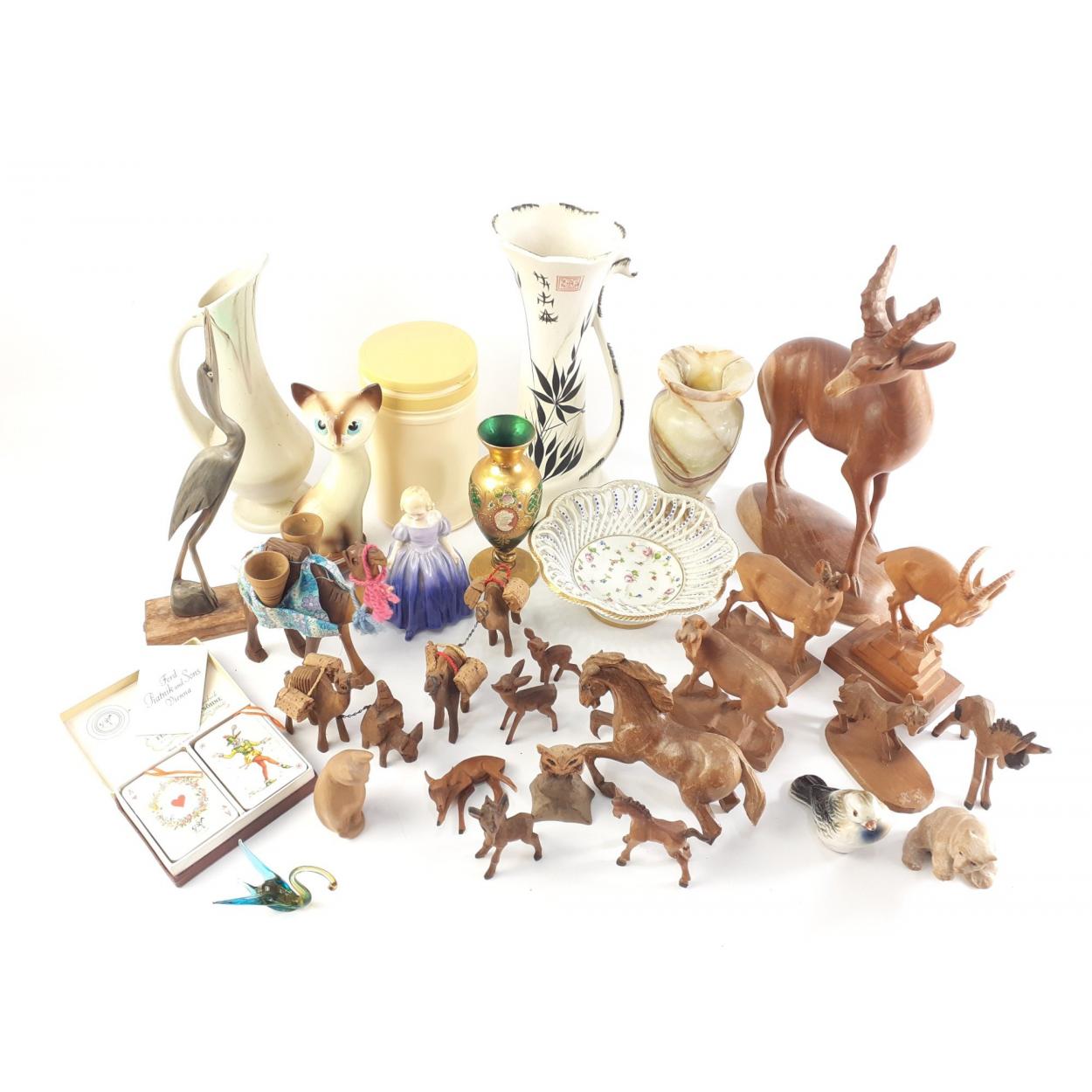 A mixed decorative lot to include two Venetian glass animals, cat ornament, Royal Doulton lady 'Marie', wooden deer and others.