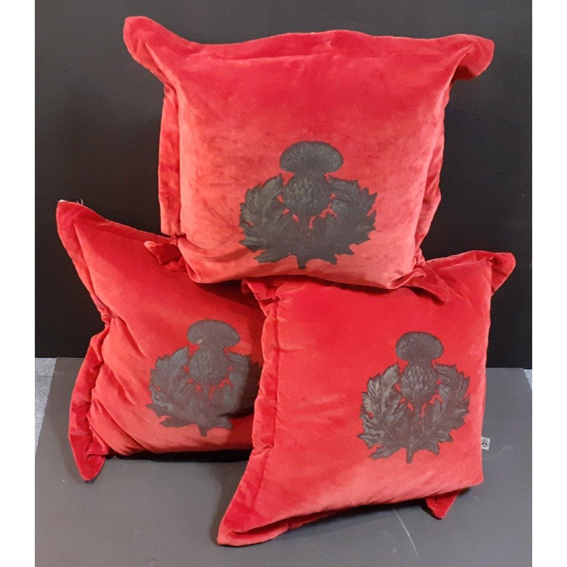 Three deep red velvet large cushions with thistle motif. W: 50cm H: 50cm approx