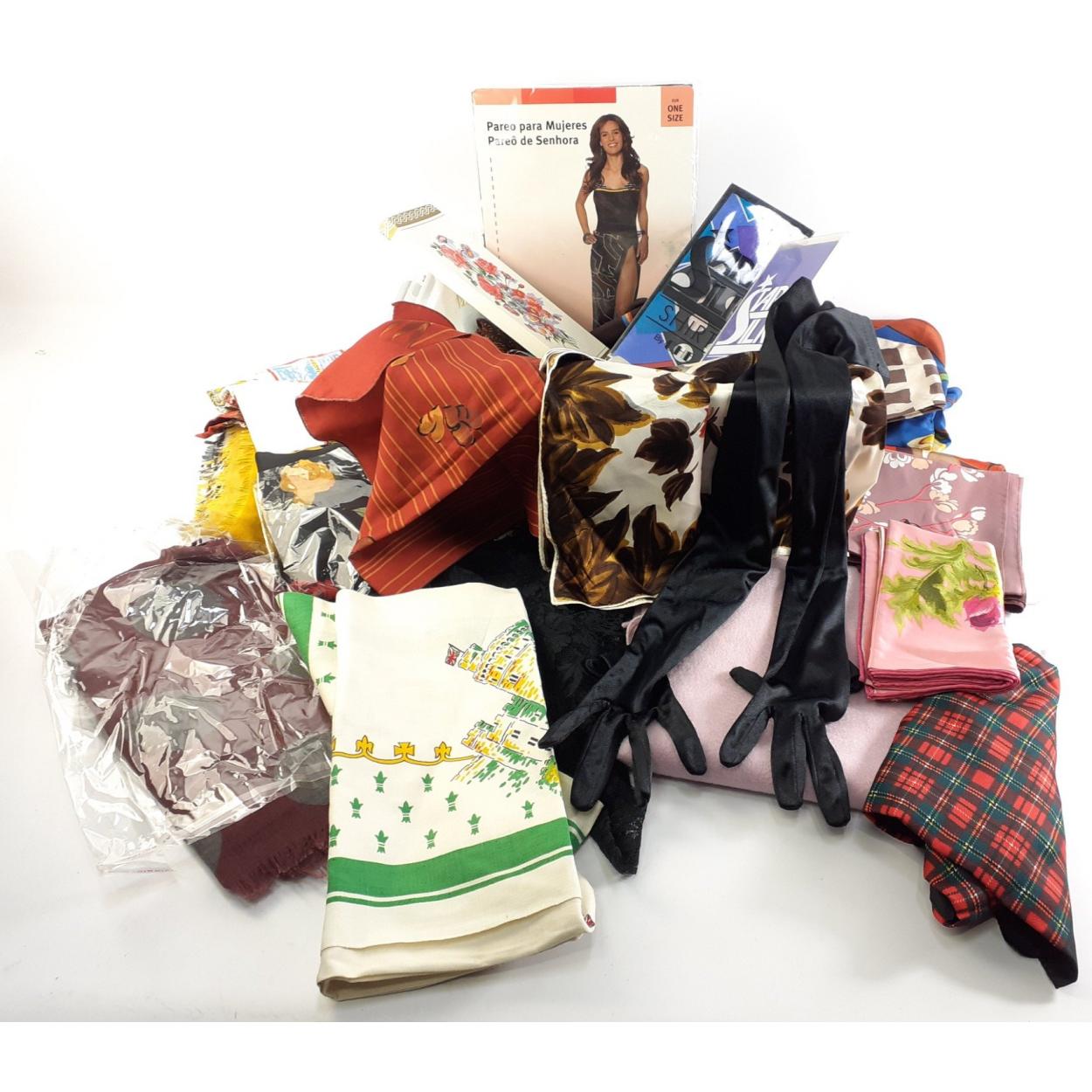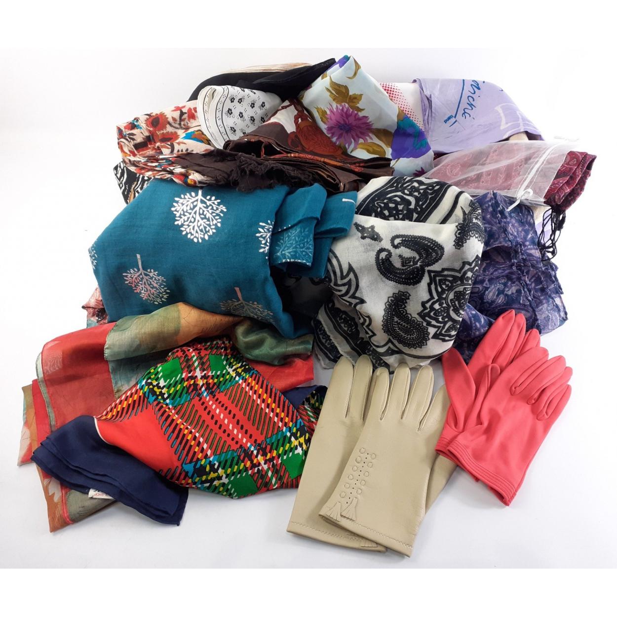 A collection of scarves and shawls to include a BARBOUR lambswool scarf, evening gloves and a mantilla. Something for everyone.