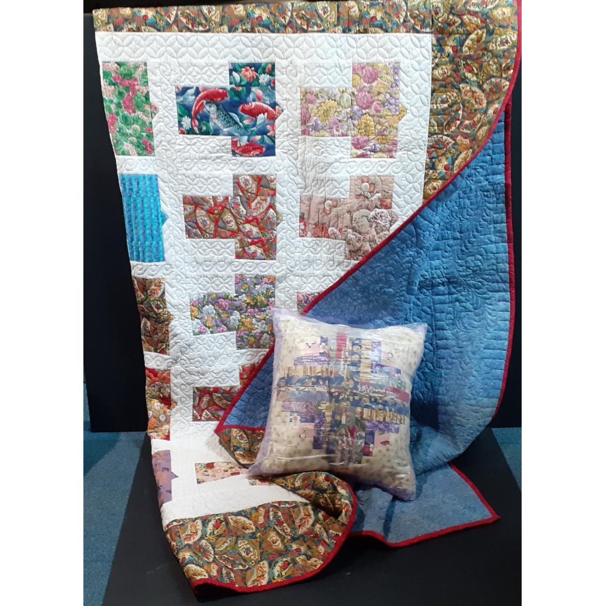 SUPER QUALITYA beautiful large patchwork quilt with lovely floral pattern with kimono shapes, a very striking piece. 100cm square approx. With a patchwork style cushion.