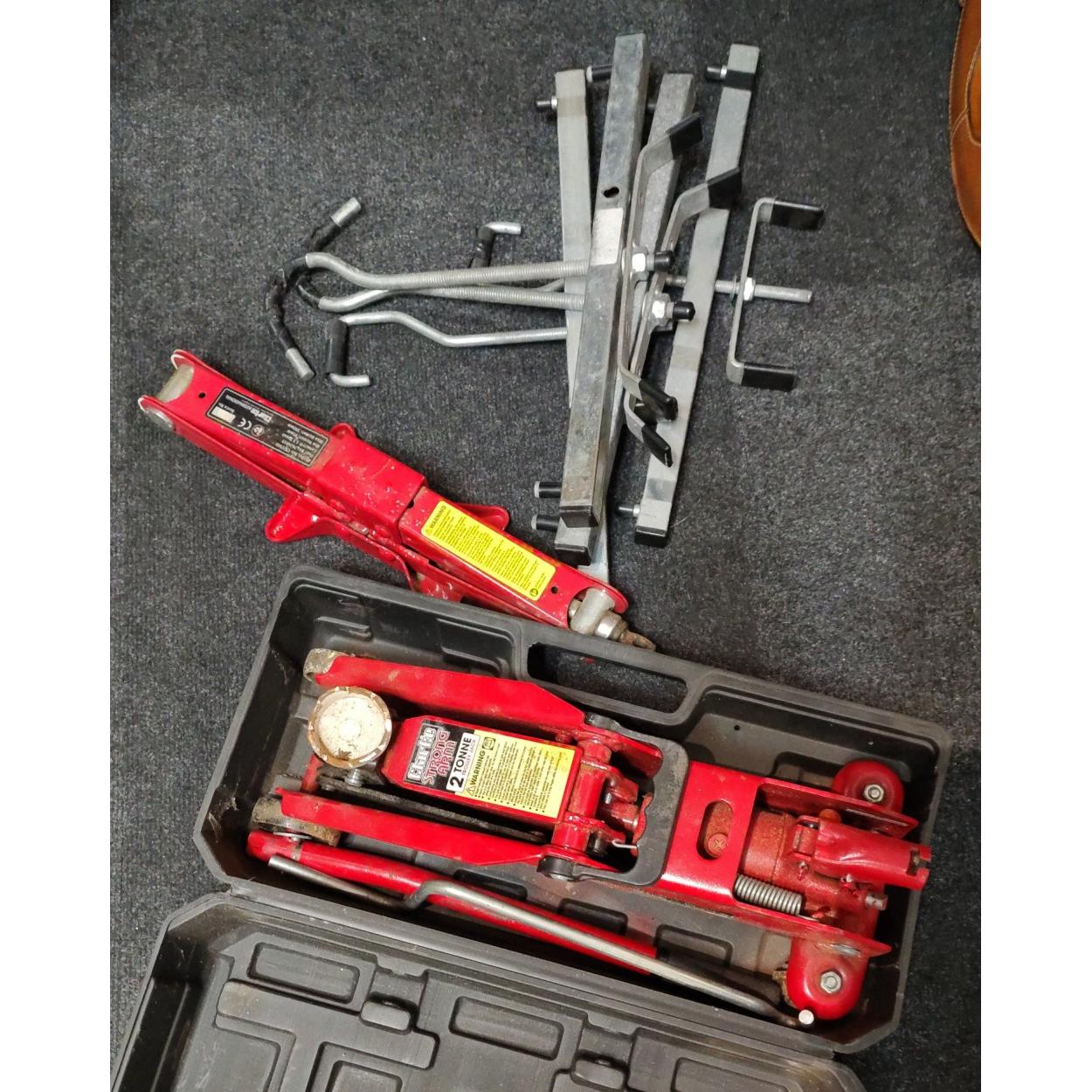 A two tonne CLARKE car jack in case. Comes with another CLARKE jack and four vehicle roof-rack clamps forladders