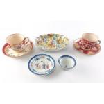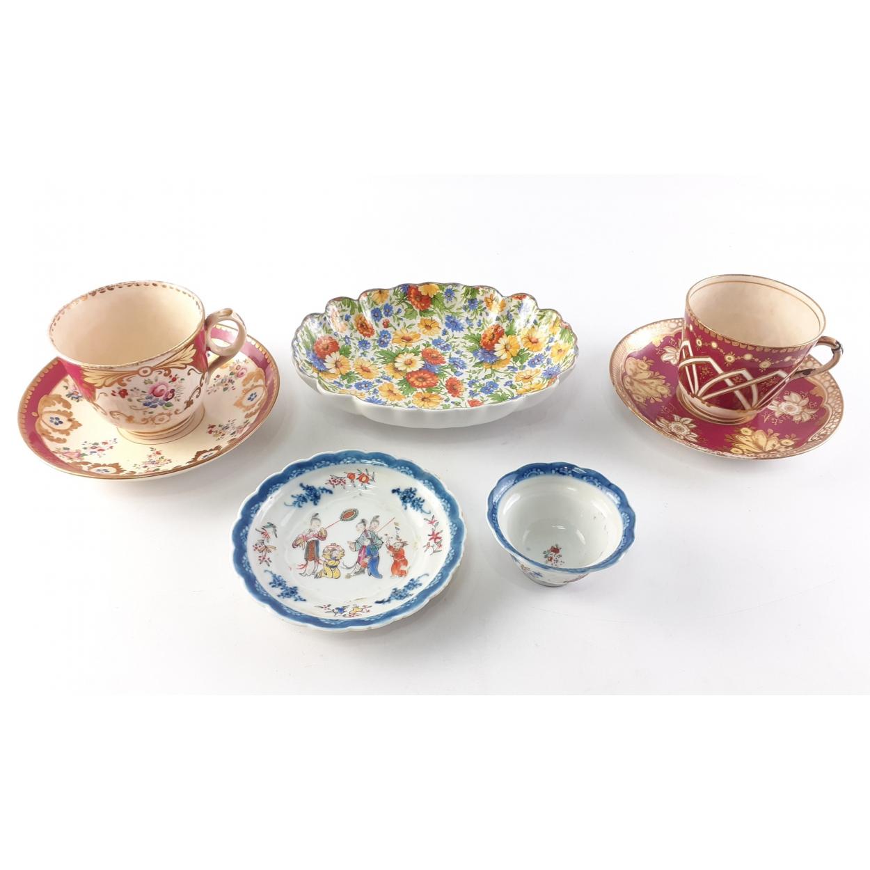 A small collection of interesting cups and saucers, includes a oriental tea bowl and a bone china cup with an older rivertted repair. Interesting pieces.