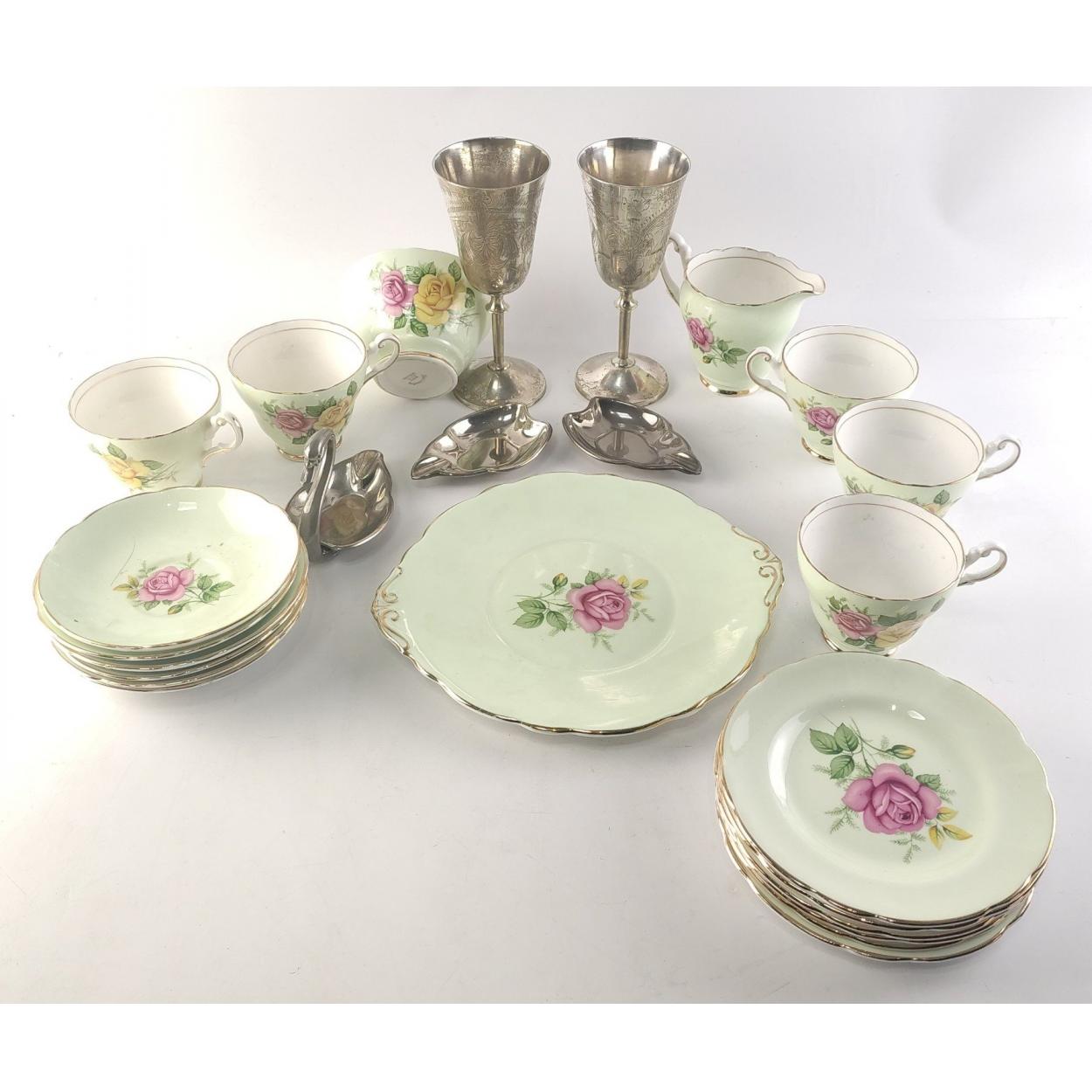 Part HARROWBY Bone China tea service, with 5 cups. In nice condition. Also two plated goblets.