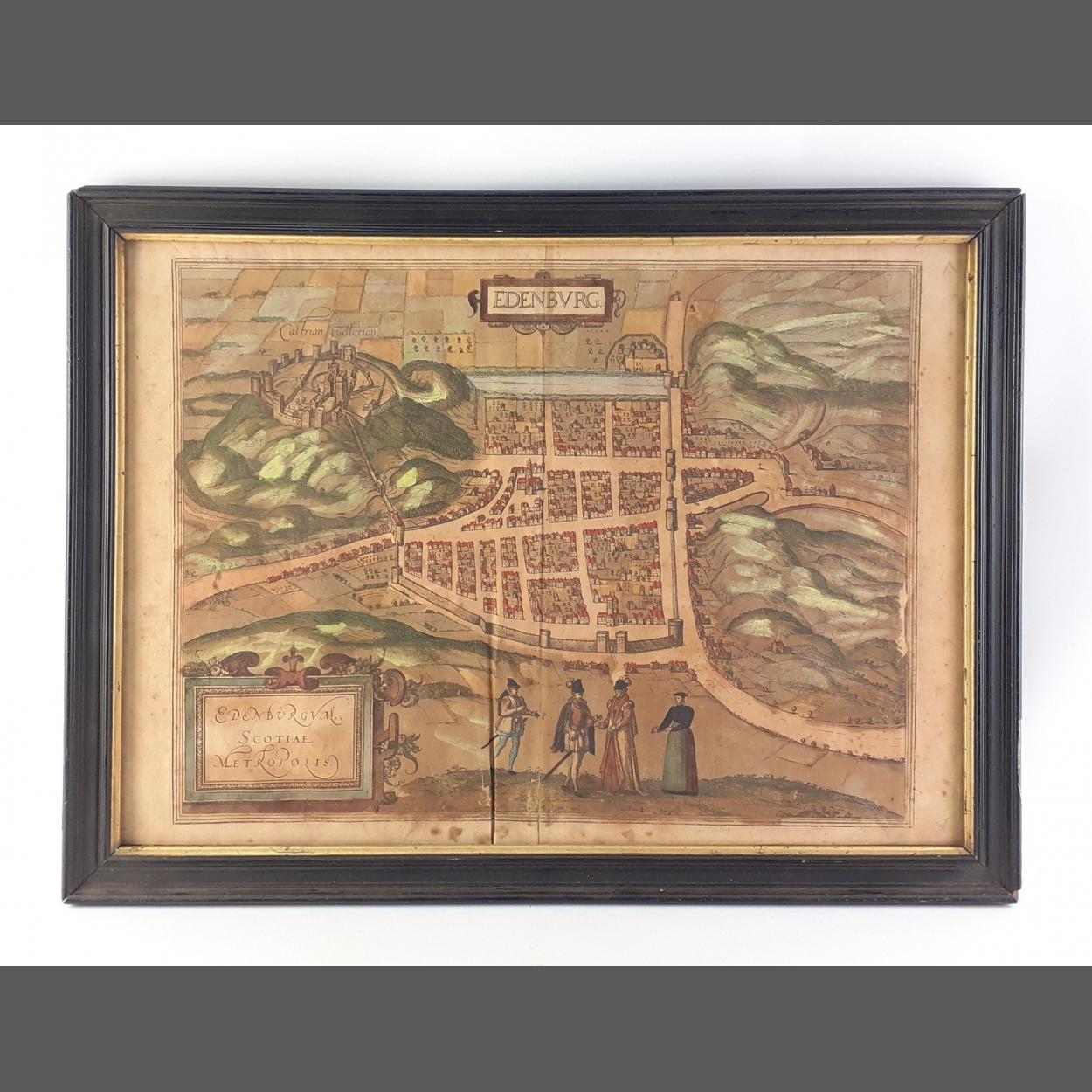 A very old framed engraved paper map EDINBURGH SCOTIAE METROPOLIS 55cm x 40cm. possibly by Franz Hogenberg. Note this is a very old fragile piece not a modern reprint.