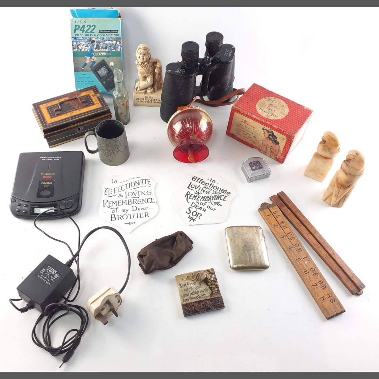 Mixed lot. Portable hand held TV, CD player, Pifco massager, Zenith binoculars, TSB money bank, folding measures and much else.